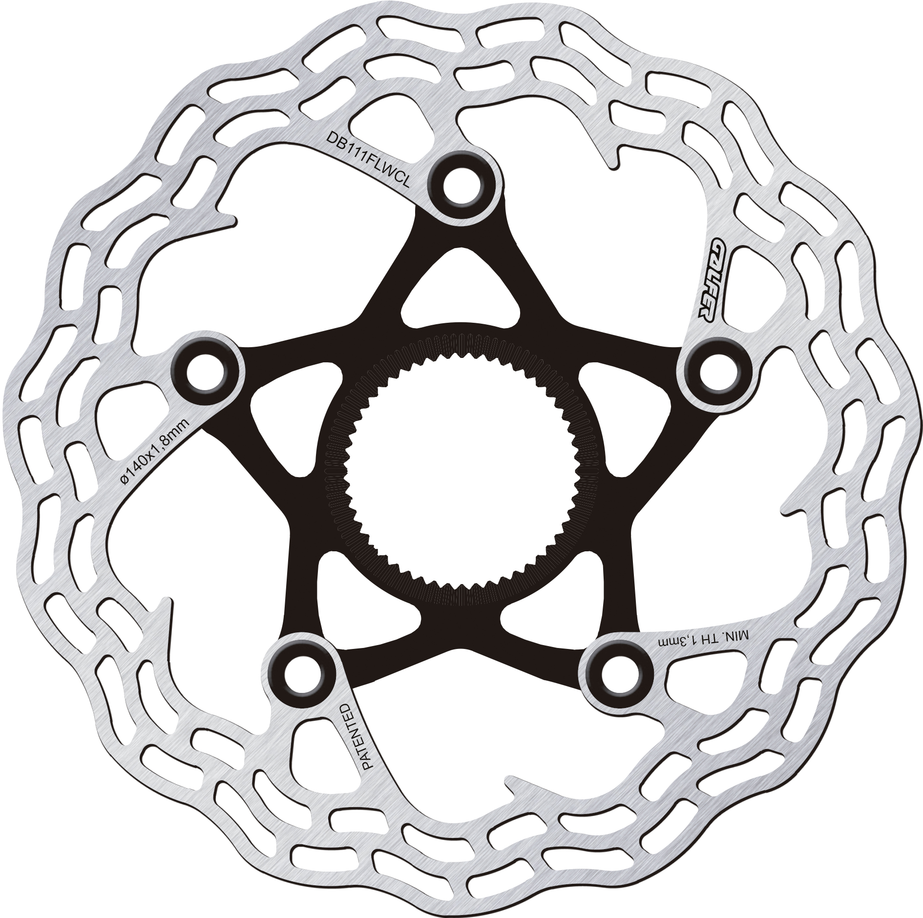 - 물결 모양 디자인은 정밀하고 점진적인 제동 제어를 제공합니다. 지느러미는 트랙 외부에 위치하여